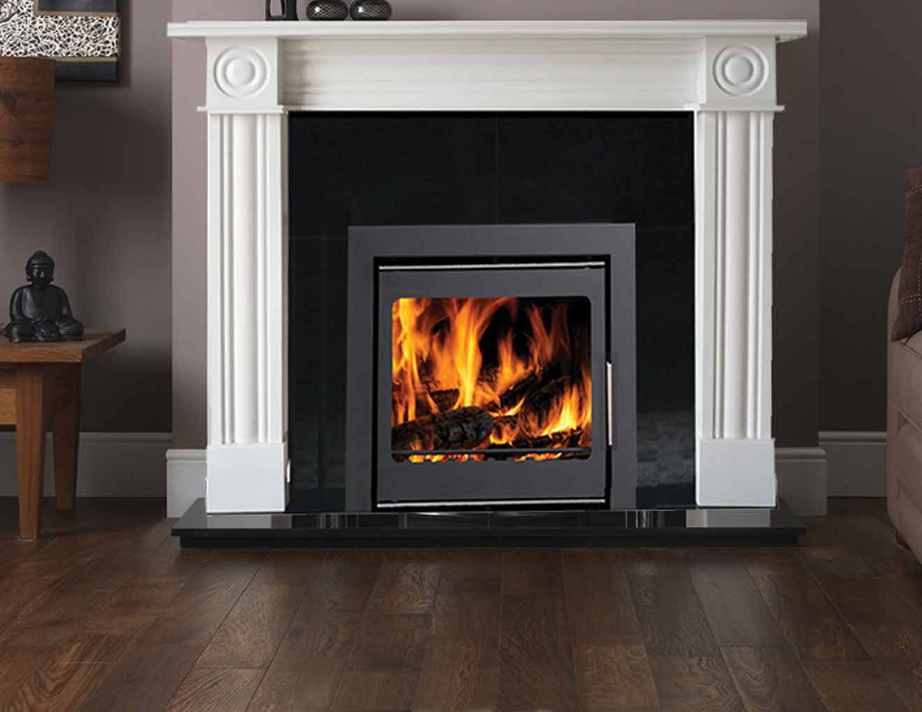 Pictured with black granite hearth, back panel and Vitae 6kW Cassette Stove.